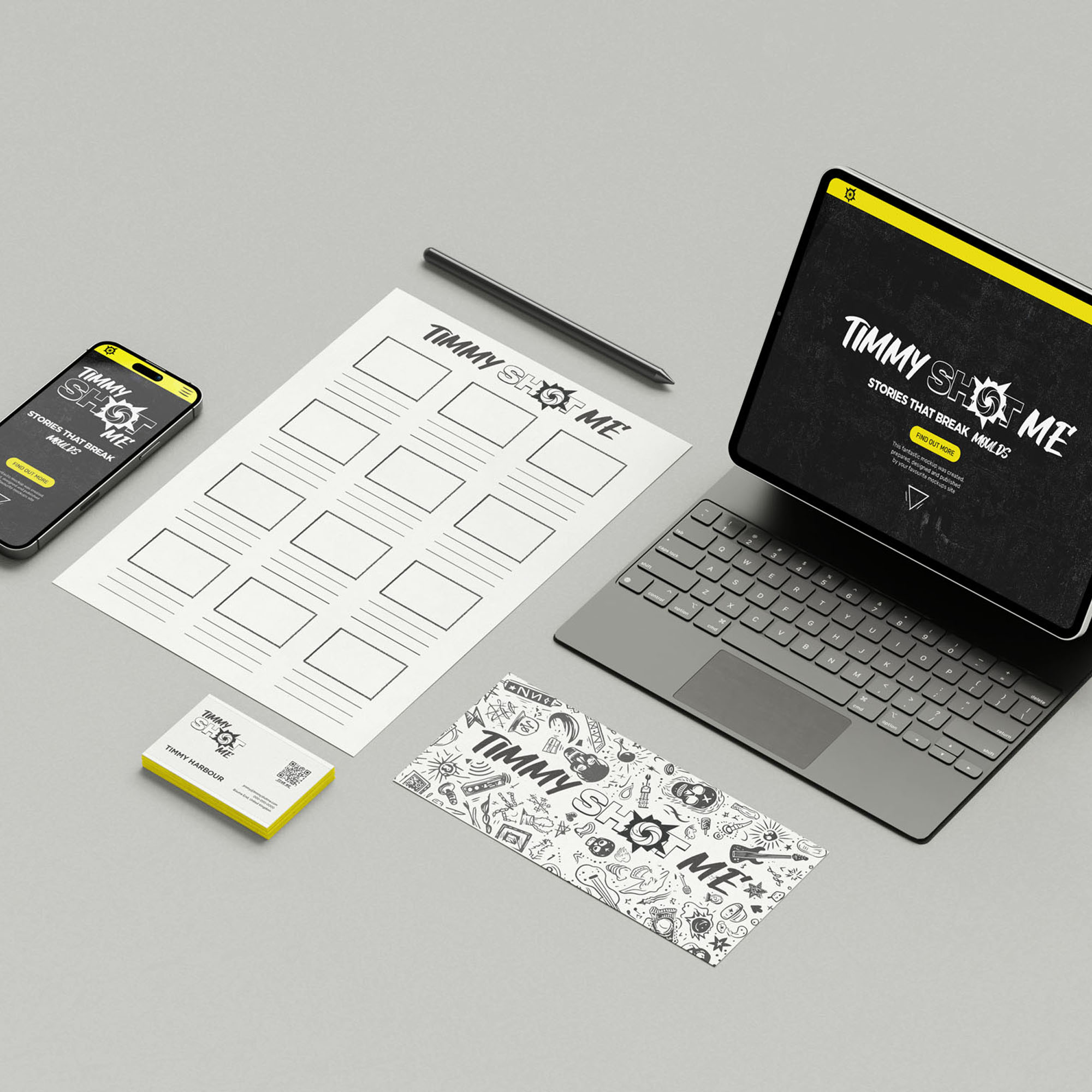 Timmy Shot Me is a creative studio born from the mind of a music producer turned filmmaker. For this case study submission, the challenge was to develop a bold, cinematic brand identity that captured the energy of Timmy’s work—gritty, expressive, and rooted in the cultural intersections of hip-hop, punk, and protest art. The brand needed to feel raw yet current, and flexible enough to be applied across both professional and narrative-driven contexts.